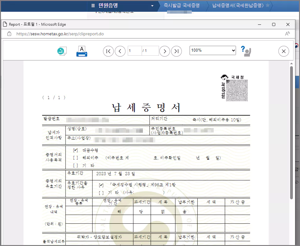 - 처리완료 문서 출력: 모든 과정이 완료되면 국세완납증명서를 출력할 수 있습니다.