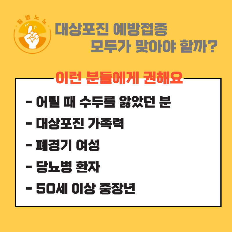 대상포진 예방접종은 일반적으로 50세 이상의 성인에게 권장됩니다. 이는 나이가 들수록 대상포진 발병 위험이 높아지기 때문입니다. 특히 60세 이상의 경우, 예방접종의 효과가 더욱 큰 것으로 나타납니다. 단, 면역력이 크게 저하된 사람이나 특정 질환을 앓고 있는 경우에는 의사와 상담 후 접종 여부를 결정해야 합니다.