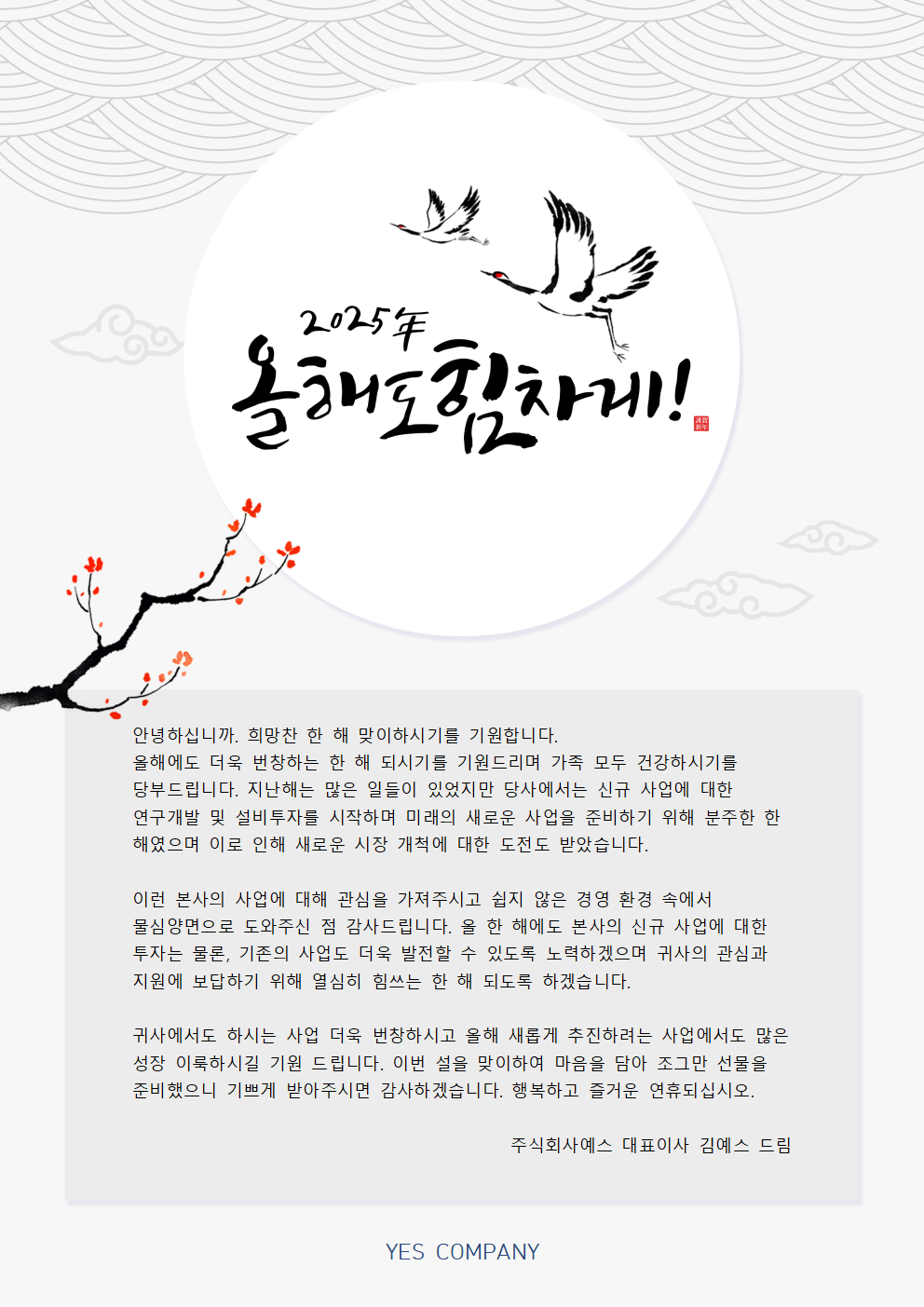 - "한 해 동안 보여주신 신뢰와 협력에 깊이 감사드립니다. 2025년에도 더욱 발전적인 관계로 함께하길 바라며, 귀사의 번창을 기원합니다."